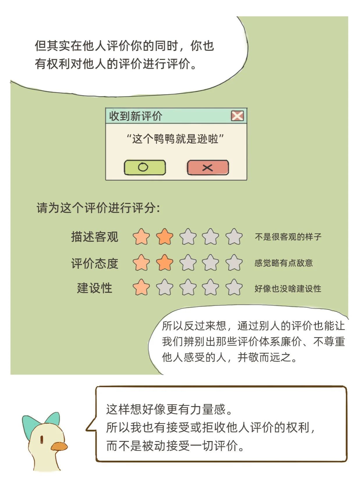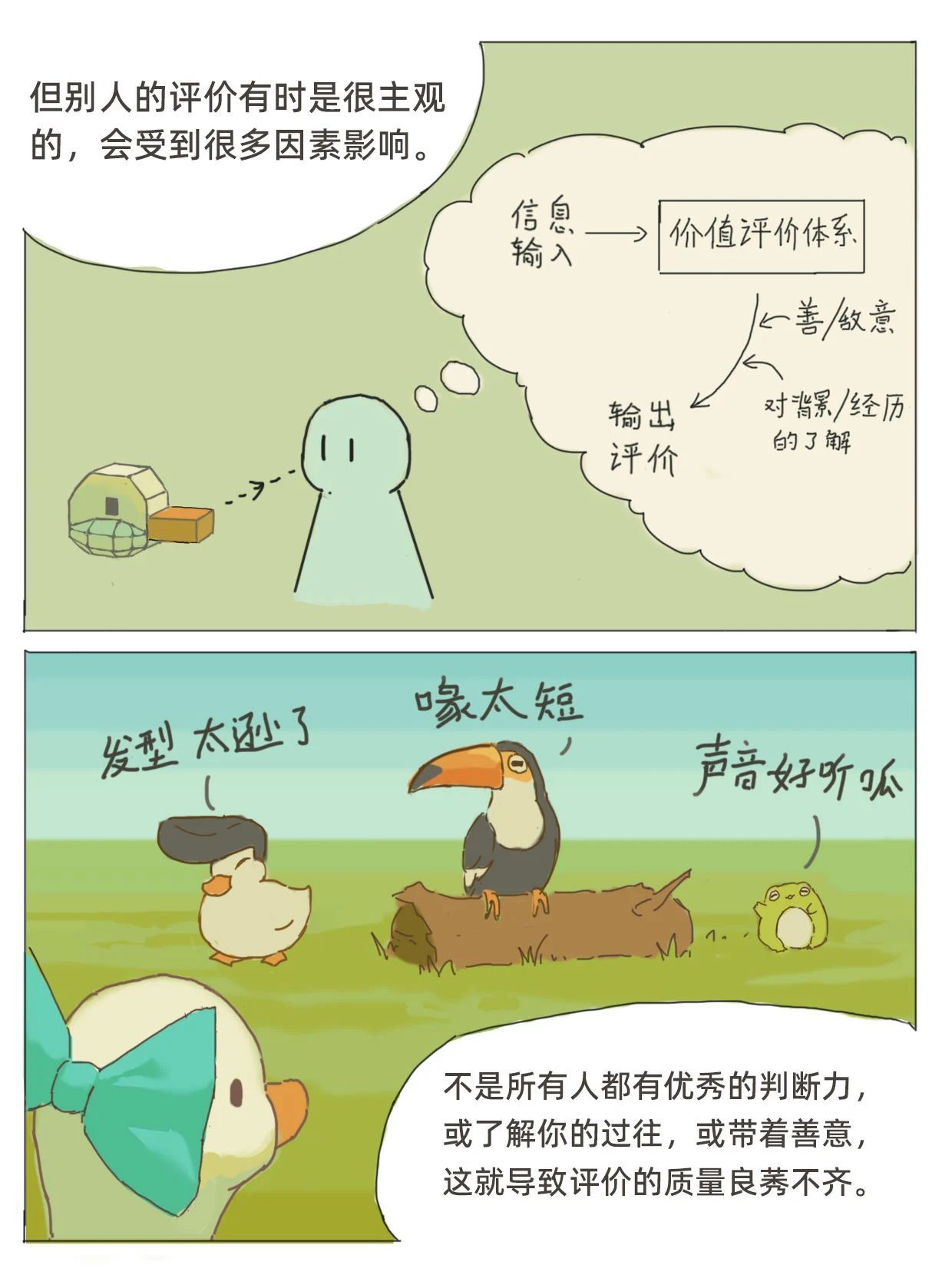 2025年3月2日,《央视新闻》公众号推送了我院优秀毕业生——@心理鸭创作的插画故事,主题为“如何对待来自他人的评价”。作者通过插画分享了关于自我接纳、正确对待他人评价的深刻见解,鼓励大家勇敢地做自己,拥有爱与被爱的能力。一起来看看吧! 如何对待来自他人的评价