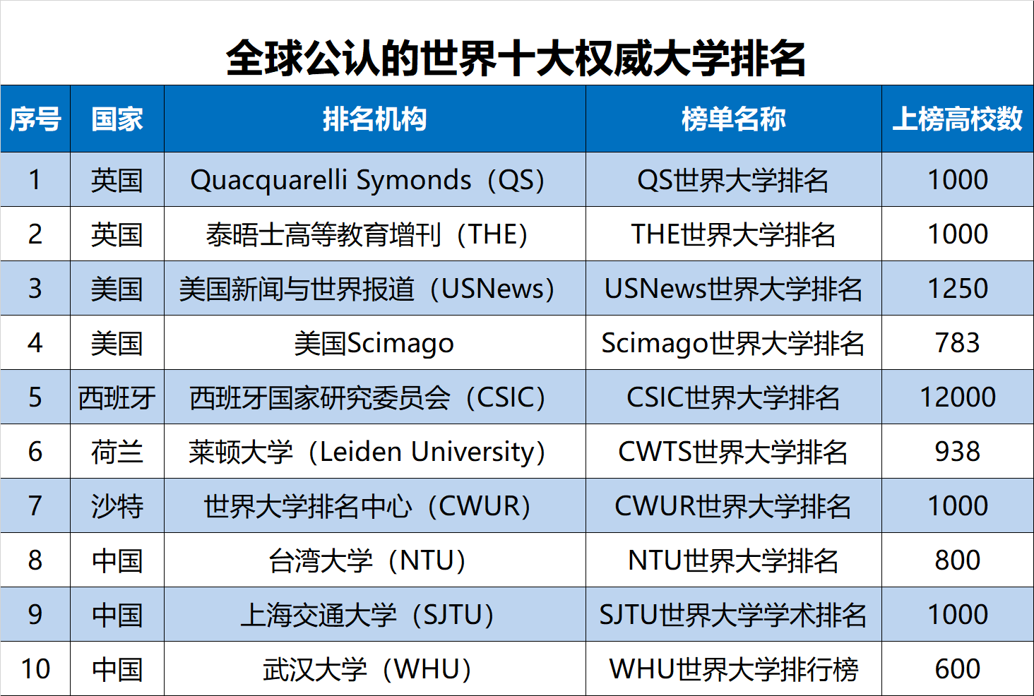 在当今全球范围内,英国QS世界大学排名、英国THE世界大学排名、美国USNews世界大学排名、荷兰CWTS世界大学排名、沙特CWUR世界大学排名、西班牙CSIC世界大学排名、美国Scimago世界大学排名、中国NTU世界大学排名、中国SJTU世界大学排名和中国WHU世界大学排行榜是目前全球公认的最具权威性、最具参考价值,影响力最大、排名历史最长的世界十大权威大学排名,是目前全球范围内评价体系相对成熟、得到了世界各国高校、主流新闻媒体、考生家长和政府部门认可的世界大学排行榜,已经成为世界大学评价研究的标杆,对认识世界各国的高等教育发展水平、了解全球大学办学实力和评估中国高校“双一流”建设成效具有重要的参考价值。