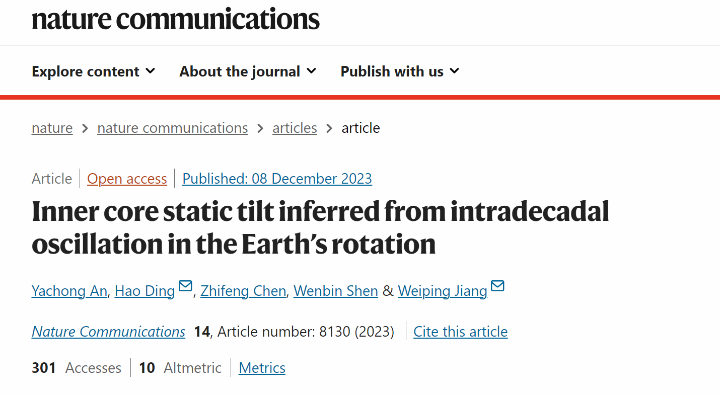 近日,Nature Communications(《自然·通讯》)在线发表动力大地测量课题组新成果,论文题目为“Inner core static tilt inferred from intradecadal oscillation in the Earth's rotation”。安亚冲博士与丁浩教授为共同第一作者,姜卫平教授与丁浩教授为共同通讯作者。