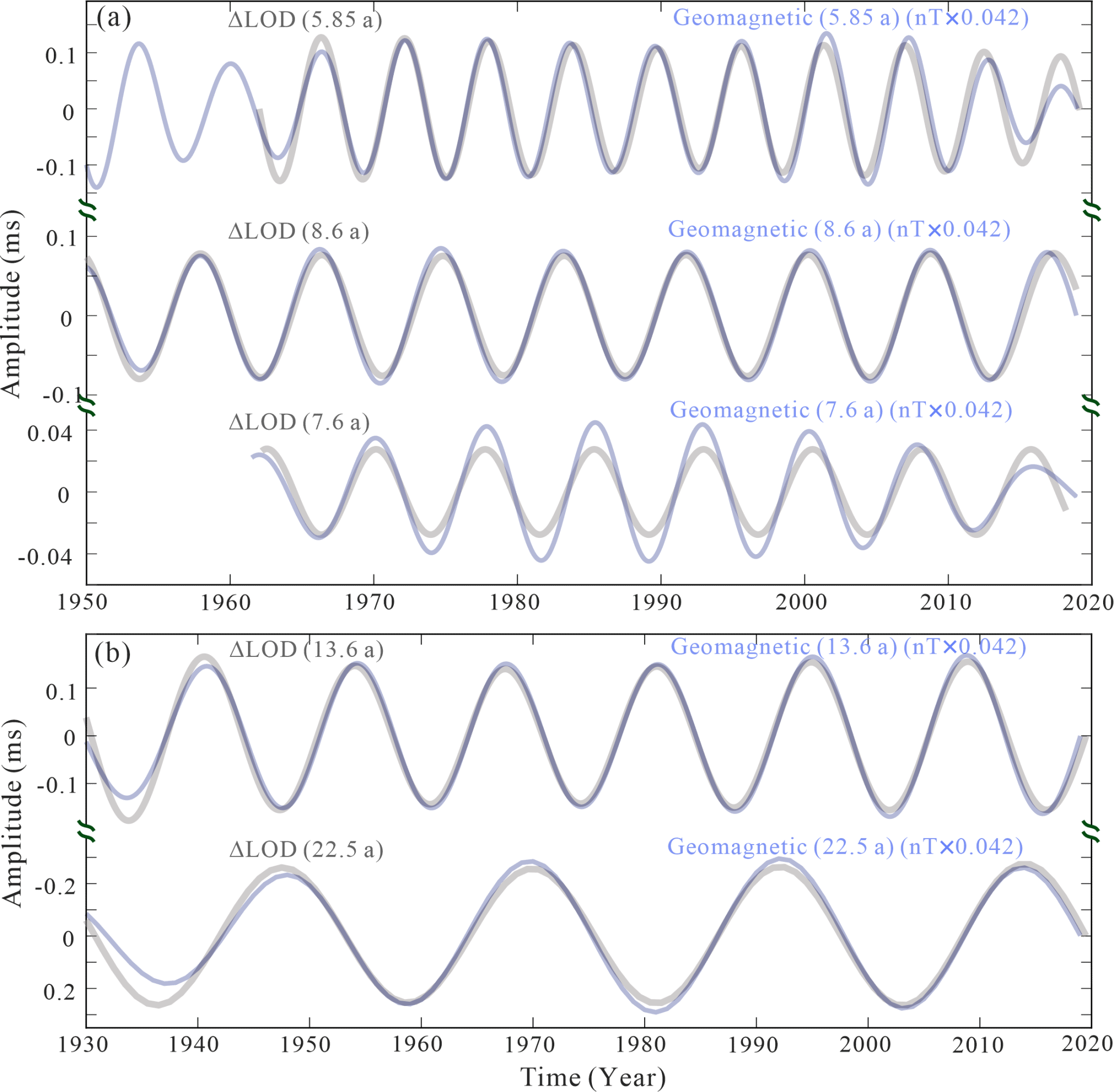 利用团队成员前期所提出的一种分析阵列数据的方法(最优序列估计),他们发现地表地磁中同时存在~5.9年, ~7.6年, ~8.6年, ~13.6年, ~15.4年, ~18.6年和~22.5年的周期性信号(图2);除5.9年和18.6年信号外,其他5个地磁信号均为新发现。他们进一步解算了这些信号的激发序列并确定了它们的空间运动模式。对比日长变化,他们发现具有球谐Y2,±2空间运动特征的5个周期性信号(~5.9年, ~7.6年, ~8.6年, ~13.6年和~22.5年)与相应的日长变化具有很好的相位和振幅一致性;这些地磁信号与相应日长变化的振幅标定因子均为相同的~0.042 (nT/ms) (图3)。这种一致性在自然界很难随机产生,唯一可能的解释是它们来自相似的地核运动。团队分析了现有的地核运动机制模型,发现它们均过于简单,而难以同时解释这些新发现;也即他们的结果表明地核运动要远比现有的假设更加复杂。虽然他们难以准确确定这些发现背后所隐含的机制,他们仍给出了一种方向性的假设,但仍需要具体的理论和额外的结果支撑。