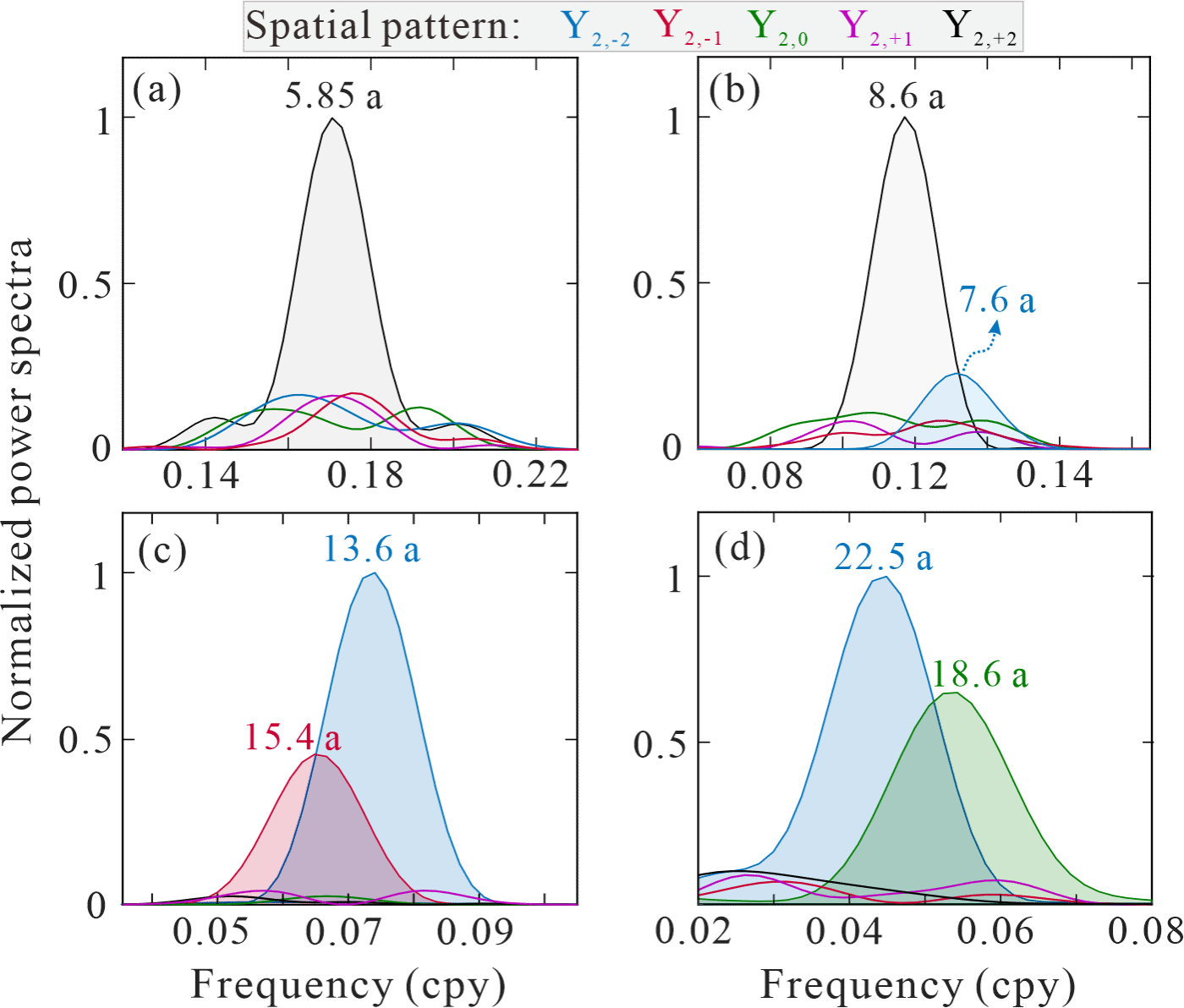 2. 利用最优序列估计方法从地表地磁观测中探测到了7个周期性信号及其对应空间运动模式(也即对应的球谐阶次)。 (来自: 丁浩 自绘)