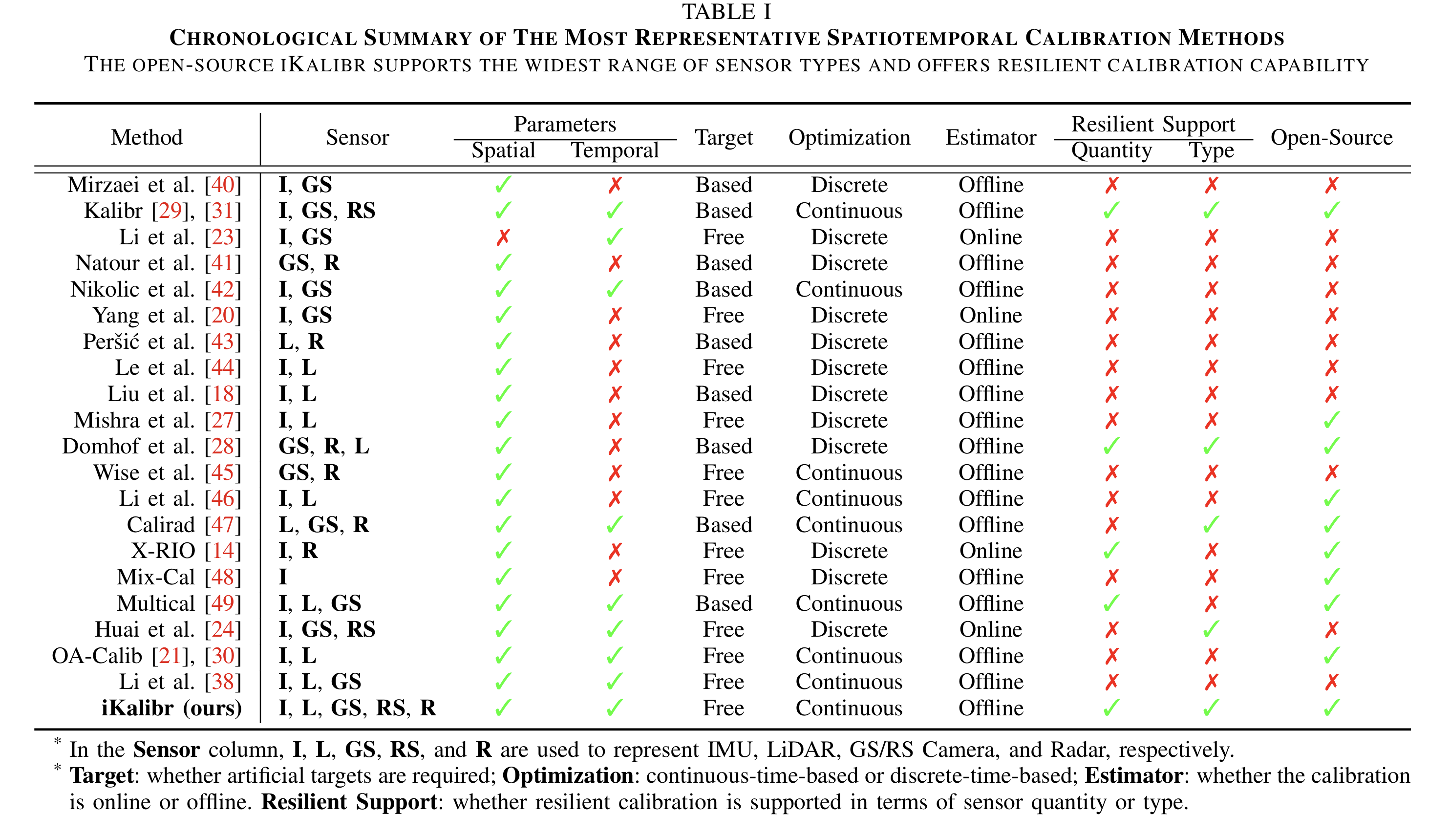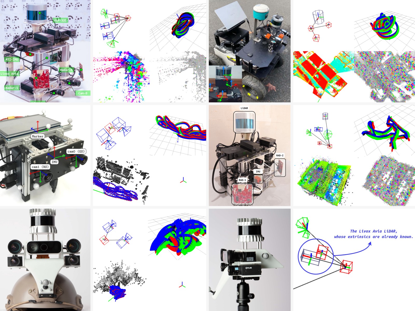 集成惯性系统(通常集成了IMU和其他外部感知传感器,如雷达、激光雷达和相机等)已在现代机器人中广泛应用,用于自运动估计、运动控制或自主探索等任务。为了提高系统的精度和鲁棒性,通常会将多种传感器集成到一起,来进一步提升系统的可用性(主要是在故障容忍、感知能力和环境适应方面)。此类系统往往需要进行准确一致的时空标定,以为后续的多源融合提供统一的时空框架。