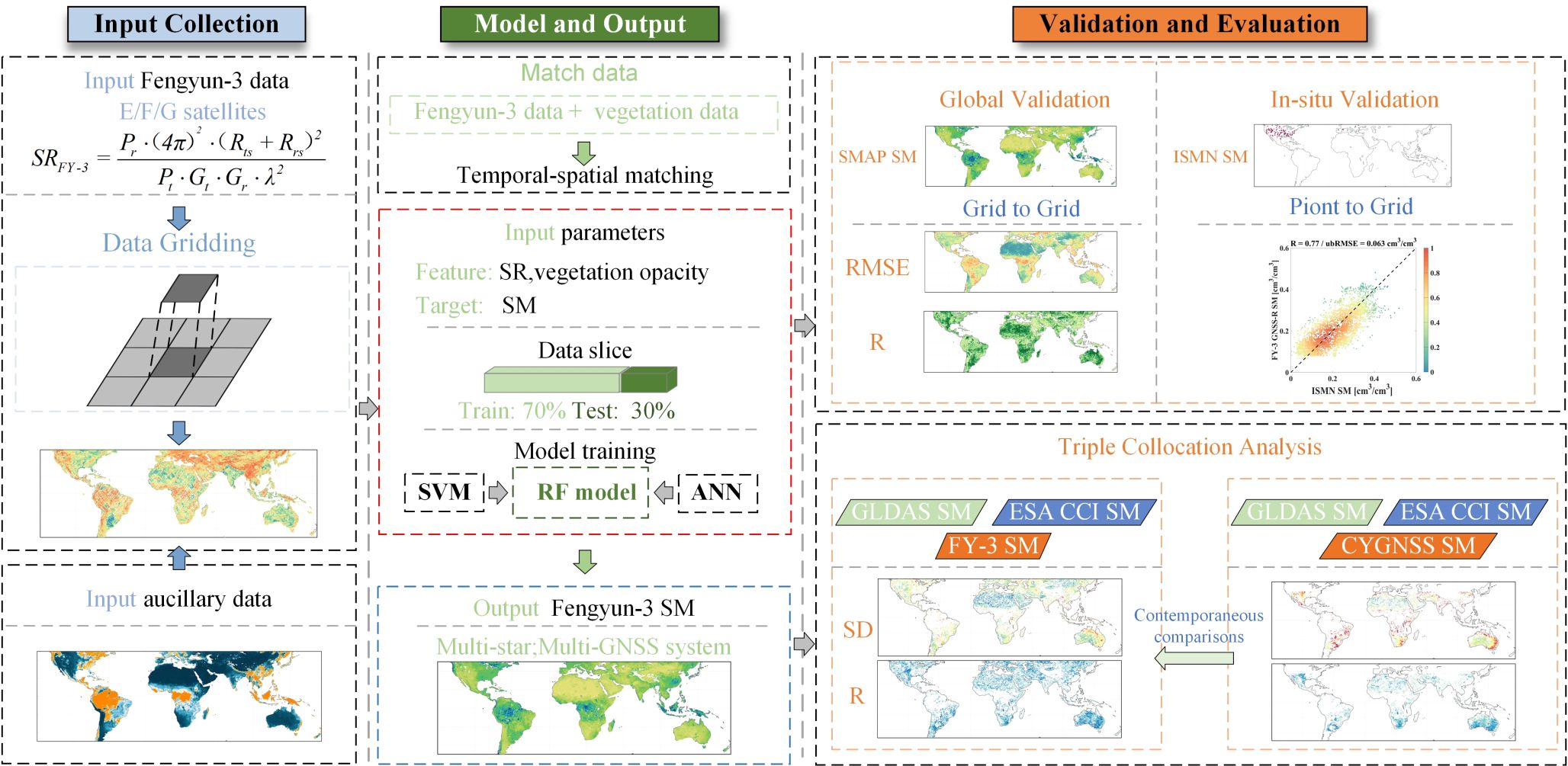 目前在轨的风云三号(FY-3)E/F/G卫星组成了GNSS-R卫星星座。本研究首次分析和验证了FY-3 GNSS-R星座观测在日尺度内进行SM检索的能力。研究旨在全面评估FY-3 GNSS-R星座在土壤湿度监测中的性能,并提出一种高效、低依赖辅助数据的反演方法。首先,研究采用了随机森林作为土壤湿度反演的基础算法。该算法通过将FY-3 GNSS-R的表面反射率(SR)与植被(辅助数据)进行时空匹配,构建输入层,并以土壤水分主动被动(SMAP)土壤湿度作为参考值进行模型训练和反演(图1)。