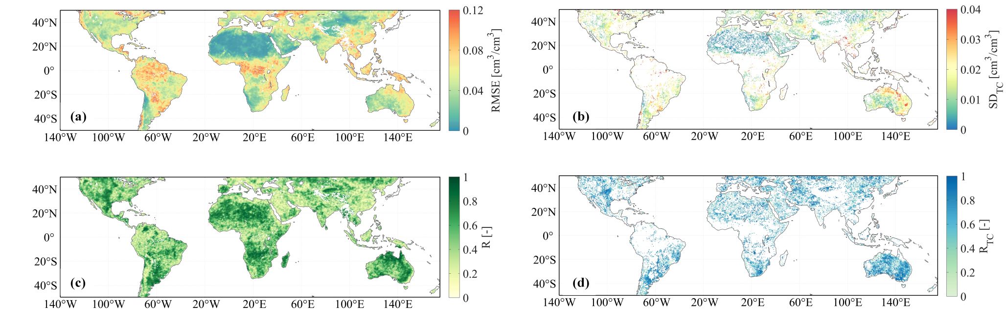 与SMAP参考土壤湿度相比,FY-3 土壤湿度表现出与SMAP一致的空间模式(图2)。在低植被覆盖区域,FY-3土壤湿度反演结果的均方根误差(RMSE)为0.039cm3/ cm3,相关系数(R)为0.53,Triple collocation(TC)分析结果表明,FY-3土壤湿度的标准差为0.017cm3/ cm3,相关系数为0.62(图3)。在超过200个独立的地面站点验证中,FY-3土壤湿度的无偏RMSE为0.039 cm3/ cm3,相关系数为0.60,显示出良好的土壤湿度时间变化一致性(图4)。TC分析和测站验证都表明,研究所提出的方法在减少系统偏差和随机误差方面是稳健而有效的。此外,研究还发现FY-3 GNSS-R星座的形成显著提高了土壤湿度监测的采样密度,与单颗卫星相比,采样密度增加了3.3倍,这为实现更高分辨率的全球土壤湿度反演提供了可能。总体而言,FY-3 GNSS-R星座观测数据在土壤湿度监测中表现出色,且与NASA CYGNSS土壤湿度产品精度表现相当。本研究也为后续生成FY-3 GNSS-R土壤湿度产品提供了参考框架,从而补充现有的全球土壤湿度数据库,为水文和气象应用提供必要的数据。