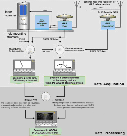 如图4所示,在数据获取过程中,装有RiACQUIRE软件的电脑控制激光扫描仪进行数据获取,同时IMU和GPS会记录方向和位置数据,IMU、GPS、扫描仪之间通过GPS时间进行同步起来。若有GPS地面基站,GPS地面基站接收的GPS数据与Riegl VMX-250移动系统中的GPS记录的数据经过差分处理,然后连同IMU记录的数据就能生成移动平台的轨迹文件,用于数据处理使用。