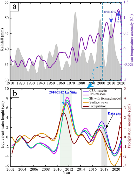 课题组基于现今空间大地测量观测技术,包括全球定位系统GPS、重力恢复和气候实验(GRACE)和GRACE Follow-On (GFO)观测数据,定量分析了过去20年(2002年4月至2020年12月)期间,澳大利亚地表水循环过程和地壳垂向运动的时空变化特性。研究发现,极端气候事件导致的降水和温度异常对澳大利亚陆地水储量(TWS)突变产生了重大影响,如2010-2012年厄尔尼诺Niño事件导致了该区域TWS的显著波动。特别是2010-2012年La Niña事件期间,TWS增强与降水量增加有高度相关性。