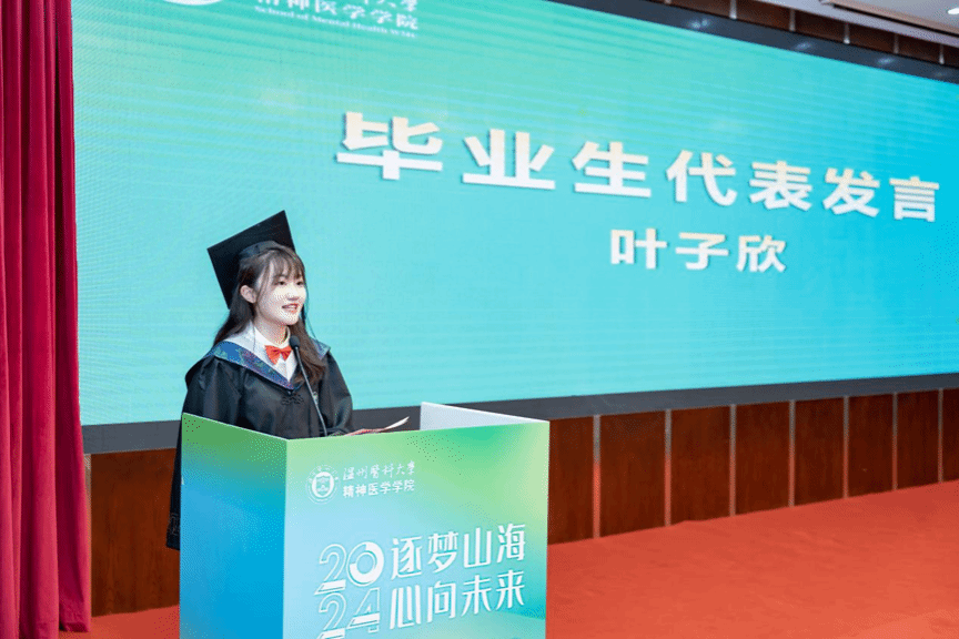 参加新生团辅、心理微电影比赛、心理嘉年华活动、关爱阿尔茨海默老人志愿服务活动……毕业生代表叶子欣回顾了在大学校园里的点点滴滴。成功考上研究生的她选择成为第26届研究生支教团的西部青年志愿者,她表示会努力将个人理想融入党和国家事业中,致力于将心理赋能于社会服务、乡村振兴,成为具有医学底蕴和心理人文关怀的时代新人。