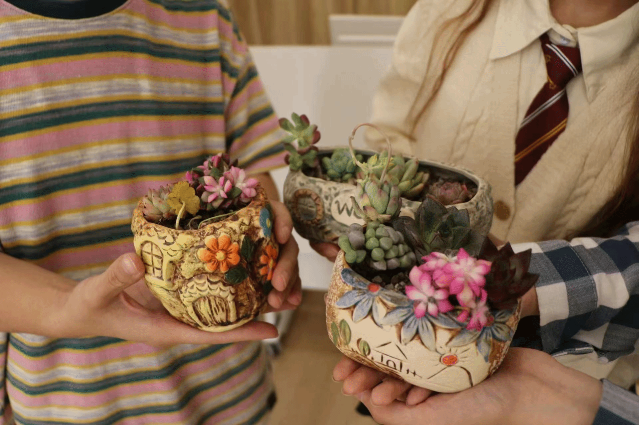 在充满园艺乐趣的种植多肉环节。同学们精心挑选自己喜欢的花盆、多肉小苗,耐心地培植一盆盆自己的多肉。在全身心的园艺过程中,同学们的内心收获了舒缓与宁静,也希望这小小的多肉,能让同学们记得这次团辅的宝贵心灵疗愈。