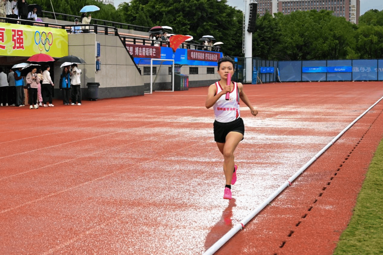 连绵的细雨浇不灭场上选手的热情,也冲不散凝在一起的心。迎着雨,接力棒在手与手之间飞快地传递,见证了精医健儿在赛场上的傲然雄姿。来自我院任雪儿、李佳、陈莹、蔡昕蕾组成的4*100接力队和潘涵博、陈莹、蔡昕蕾、李佳组成的4*400接力队配合默契,交接迅速,分别取得了第五名和第六名的好成绩。来自我院孙雨圻老师、谢晓丹老师、刘小月老师、徐景老师组成的教师组4*100接力队展现出了高超的身体素质与默契的团队配合,取得了第六名的好成绩。