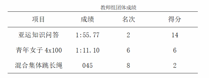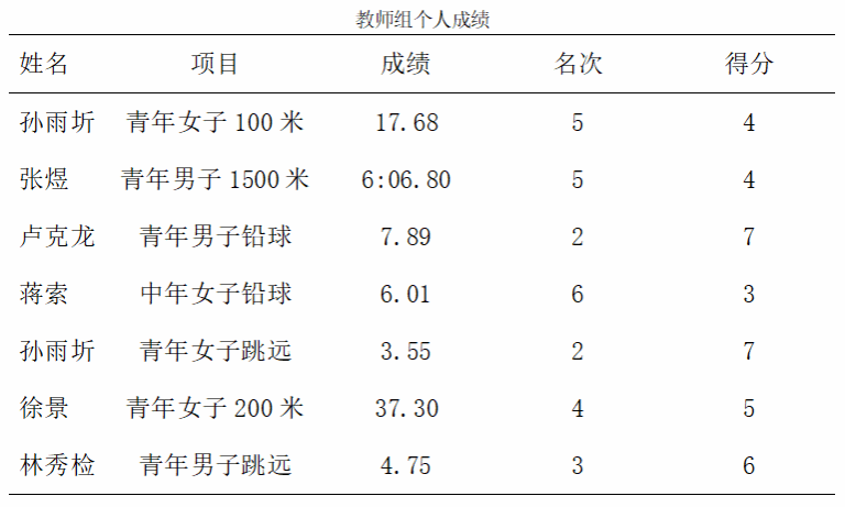 经过两天的精彩拼搏,我院代表队分别赢得了学生组团体总分第五名,学生组田径团体总分第六名,教工乙组团体总分第八名的优异成绩。这是全院运动员与师生们共同努力得来的成果,也是我院师生顽强拼搏,勇创佳绩的表彰。