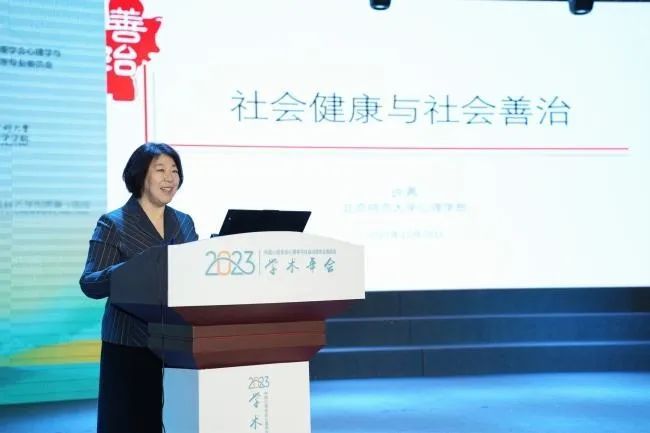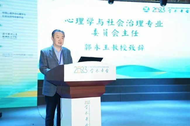 接下来,心理学与社会治理专业委员会主任委员郭永玉教授致辞。郭永玉教授围绕大会主题“健康治理的心理学行动”,强调当前突发公共卫生事件、战争和气候危机等多个因素对人们的身心健康构成了挑战。面对这些多方面的、动态演变的危机事件,郭教授提出,我们需要有效反应的、系统的、不同层面的健康治理。