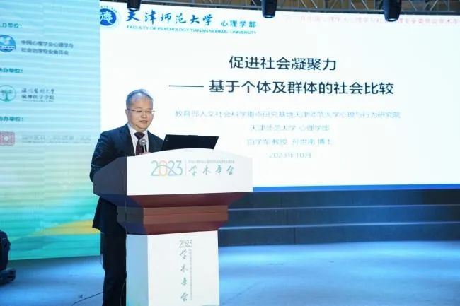 天津师范大学白学军教授以“促进社会凝聚力:基于个体及群体的社会比较”为题,将社会比较分为“上行”“下行”两种类型,介绍了团队通过信心水平对社会比较方向选择及自我评价的影响等三个实验,探究了个体与群体在“内卷”与“摆烂”之间的心理机制。