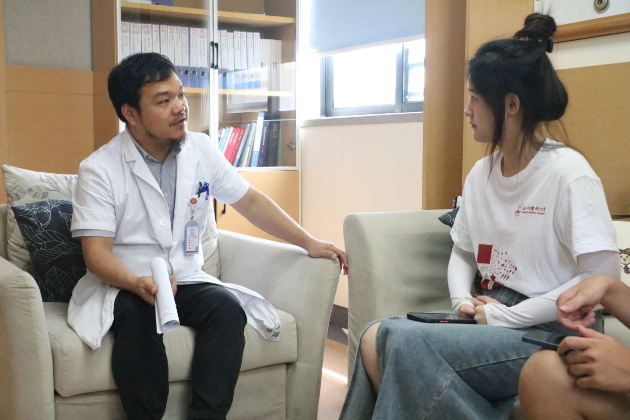 实践团对康宁医院林光耀医生和律禾多医生进行了访谈。志愿者们以“康宁访谈询问近况,反思改进携手向前”为主题,对当代青少年心理健康状况进行了采访。林医生强调:随着社会与科技发展,社会压力、文化因素、电子产品、教育模式等因素的改变都对青少年心理产生影响,使青少年患精神障碍的比率增高,并呈现低龄化趋势。律医生介绍了艺术治疗的方法和过程。他告诉我们,艺术治疗通过艺术形式的参与和互动,患者能够更好地理解和处理自己的情绪问题,达到治疗的目的。两位医生结合临床经验与生活实际为我们列举了许多真实案例,并提出了相应的宝贵建议,让我们对青少年心理障碍问题有了更多的认识。