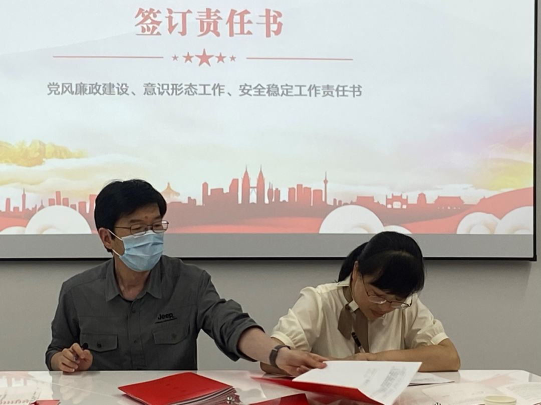 党委书记许冬武与各支部(科室)负责人一同签署《党风廉政建设责任书》《意识形态工作责任书》《安全稳定工作责任书》。