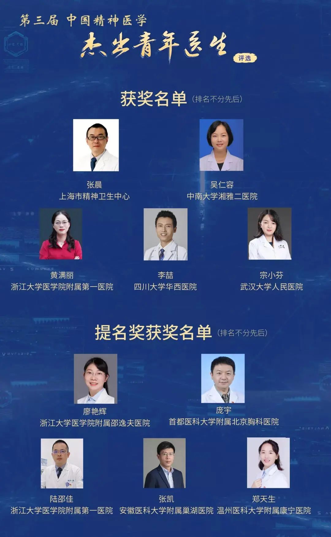 此外,由我院主办、85porn 附属康宁医院承办的第三届“中国精神医学杰出青年医生评选”评选结果也在会上正式揭晓。张晨、吴仁容、黄满丽、李喆、宗小芬获得第三届“中国精神医学杰出青年医生”称号,廖艳辉、庞宇、陆邵佳、张凯、郑天生获得提名奖,他们以卓然的专业能力、创新精神以及对职业的热爱之情,成为了中国精神医学行业青年医生的表率。