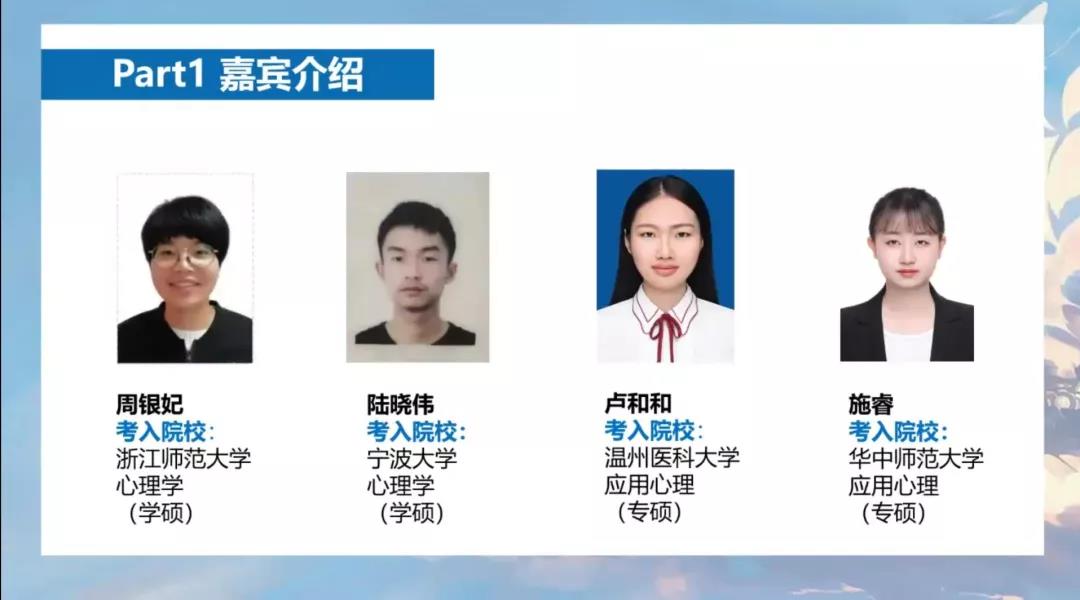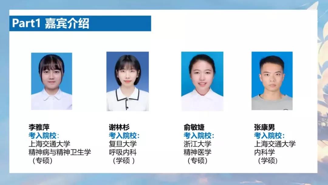 线上考研经验分享会采取现场直播的方式进行。此次的直播分享会邀请了来自85porn 其他医学专业的毕业生浙江大学医85porn附属二医院骨科胡邵隽、浙江大学医85porn附属二医院神经内科陈罗薇、复旦大学眼科沈燕、上海交通大学医85porn附属精神卫生中心吴观福、上海交通大学附属仁济医院心外科王恒、中国医科大学妇产科王雯可等为大家分享考研相关建议。