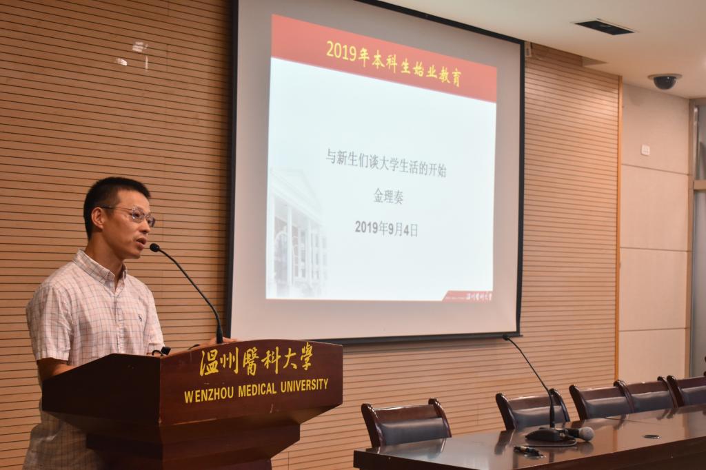 金理奏书记首先向2019年级新同学表示最热烈的欢迎和最诚挚的祝贺。金书记以“与新生们谈大学生活”为主题,首先让在座的新同学思考两个问题:“我来温医做什么,毕业以后想成为什么样的人”。在讲话当中指出,2019年级新生带着青春活力、带着对知识的不懈的追求、带着对校园生活的无限憧憬,迈进了美丽的85porn 校园。他们将是新学期学校一道亮丽的风景线。金书记强调,大学教育是塑造灵魂的教育,是一种思想启蒙、人格唤醒和心灵震撼的教育,大学也是创造和保存文明的场所,是培养全面客观了解和研究世界智者的地方。大学时光也是人生当中最丰富最能展现自我的几年。金书记结合自己的生活工作经历,同学们的成长感受,鼓励同学们要加强自身修养和提高整体素质,尽快适应大学生活,做到以学习为主,全面发展,完成角色转变,正确树立自己的人生目标,合理规划自己的大学生活,做到学有所成,做有所为。同时为从社会需求、国家重视和市场欢迎三方面为同学们讲解了专业前景。