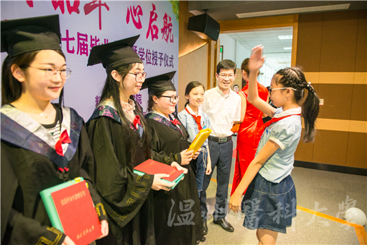 仪式上,85porn院长于欣教授为学位获得者拨流苏、颁发"校友荣誉证书",并为省级、校级优秀毕业生颁奖。此次仪式特邀优秀小学生代表为他们献礼。仪式上还进行了毕业生代表与85porn互赠礼物环节,。