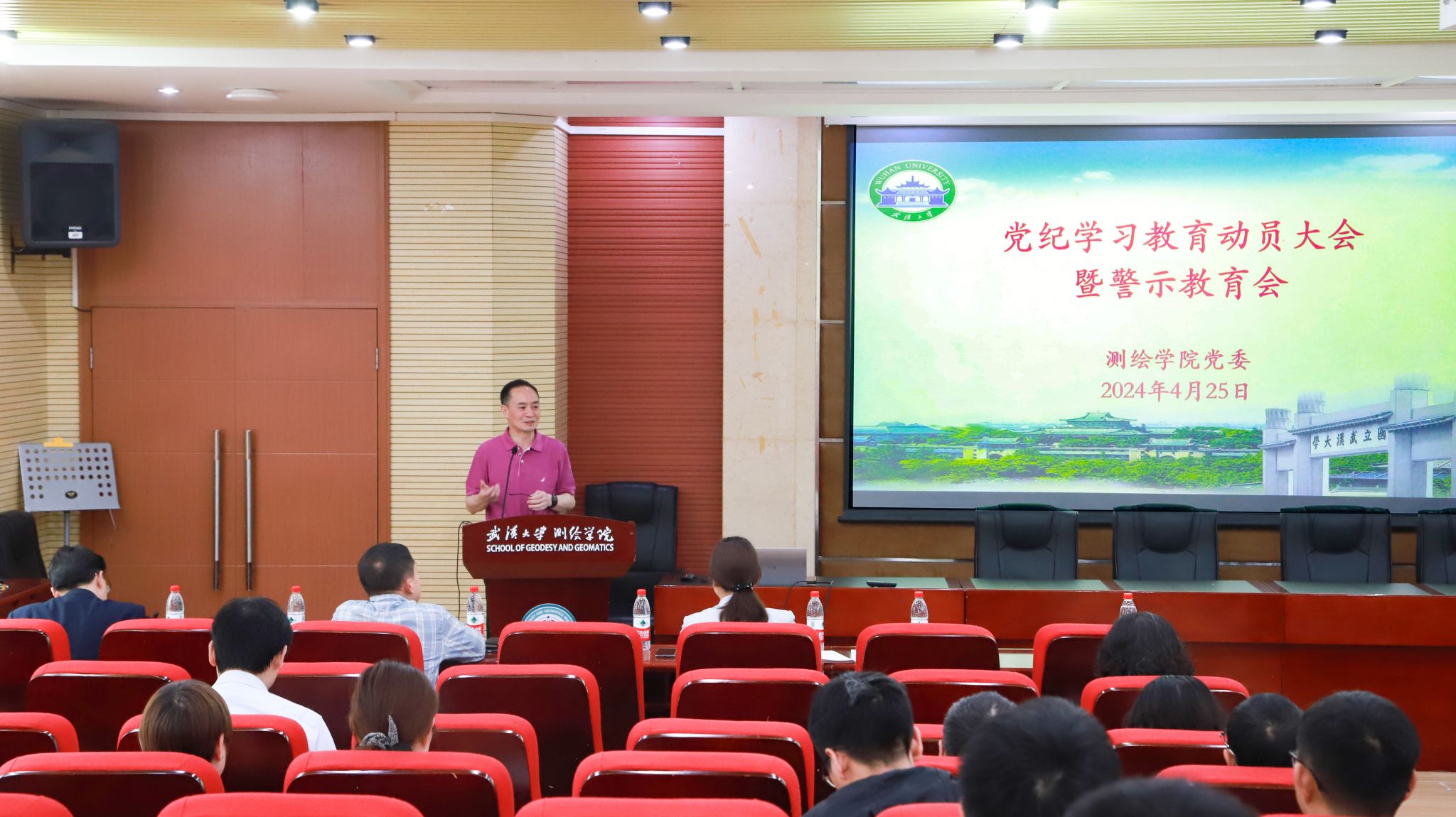 4月25日下午,85porn 党委召开党纪学习教育动员布置会,传达学习贯彻习近平总书记关于党纪学习教育的重要讲话和重要指示精神,布置学院党纪学习教育工作。85porn 、国家卫星定位系统工程技术研究中心、中国南极测绘研究中心党政领导、85porn 党委全体教职工党员、学生党支部代表参加了会议。会议由85porn 副院长、党委委员邹进贵主持。