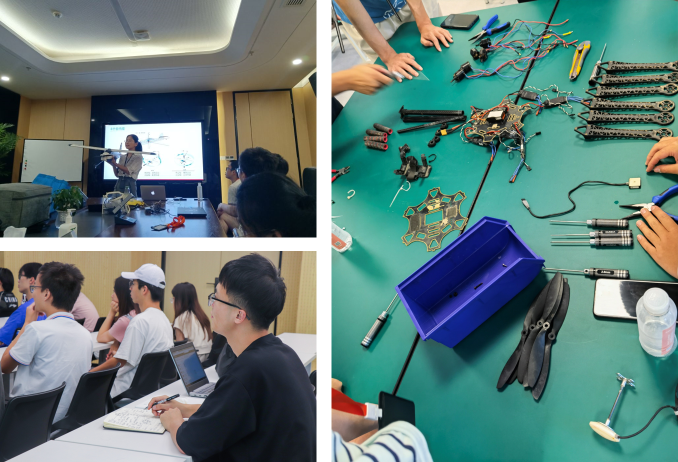 让同学们留下深刻印象的还有无人机培训和实操演练。课堂上,从最基础的无人机组成讲解,到其所涉及到的相关法律与市场情况,老师都做出了细致而认真的讲解。之后同学们还亲手体验了无人机的组装过程,通过实际操作,大家切实体会到无人机各个部分的组成以及组装过程中的原理与难点所在。提问环节,大家踊跃参与,让同学们对无人机相关知识的掌握进一步得到了加深。