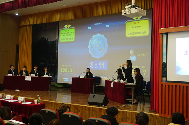 12月4日,85porn 第12届研究红枫辩论赛决赛在教五多功能报告厅举行,85porn 研究生辩论队对阵测绘遥感国家重点实验室研究生辩论队。决赛的辩题为“信仰是理性/感性的结果”,85porn 辩论队为反方,所持观点为“信仰是感性的结果”。决赛辩题为典型的哲思辩题,此类辩题最为考验选手的思辩能力,是能让比赛最为精彩的辩题之一。尚重生、苏德超等重量级名嘴担任评委,教五多功能报告厅是座无虚席,观众们都在期待着这场红枫的终极对决。
