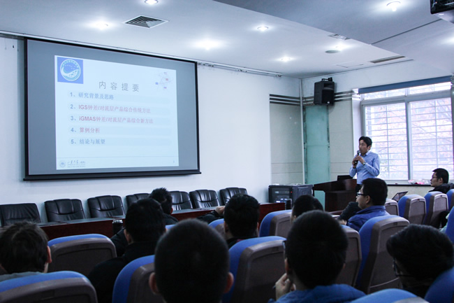 随后,徐天河教授作了题为“iGMAS钟差/对流层产品综合方法”的学术报告。他首先简单介绍了iGMAS组织的背景、目标、架构及发展情况,强调了产品综合与服务中心(ISC)是iGMAS产品再处理和对外发布中心。接着,着重介绍了iGMAS钟差/对流层产品综合的难点与解决措施,由于iGMAS站的分布、硬件配置、各家分析中心处理策略的不同导致iGMAS产品综合遇到许多新问题,提出了非线性系统误差处理、参考基准统一及残余线性偏差补偿的产品综合策略,并采用抗差估计的方法获得整体精度最优的综合产品,最后,从不同角度对各家分析中心的产品以及综合产品进行了详细的评估分析。
