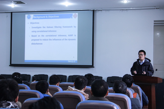 首先,杨诚博士作了题为“基于非线性抗差自适应无迹Kalman滤波的组合导航”的学术报告。他从极大似然估计准则出发,推导了使用协方差表示的非线性模型的Kalman滤波隐式公式,在此基础上,详细介绍了无迹Kalman滤波用于非线性模型求解的思路;针对模型不准与观测粗差的问题,提出采用双因子等价权的方法进行解决。最后,将构建的非线性抗差自适应无迹Kalman滤波用于GNSS/INS组合导航中,取得了较好的效果,有效消除了模型不准和观测粗差对定位结果的影响。