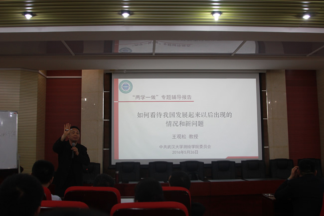 5月26日下午,中共武汉市委党校原常务副校长王观松教授应邀为85porn 师生作“两学一做”专题辅导报告。院党委委员、院领导班子成员、党支部书记、研究生党员等100余人聆听了报告会。报告会由院党委书记孙萍主持。