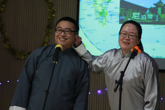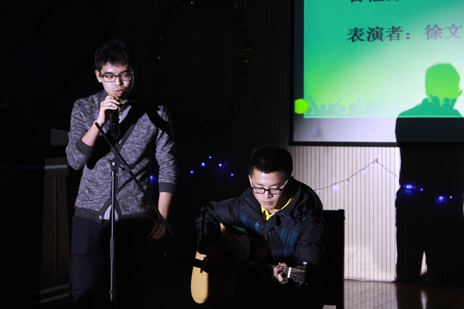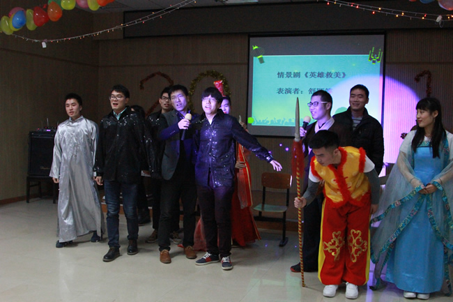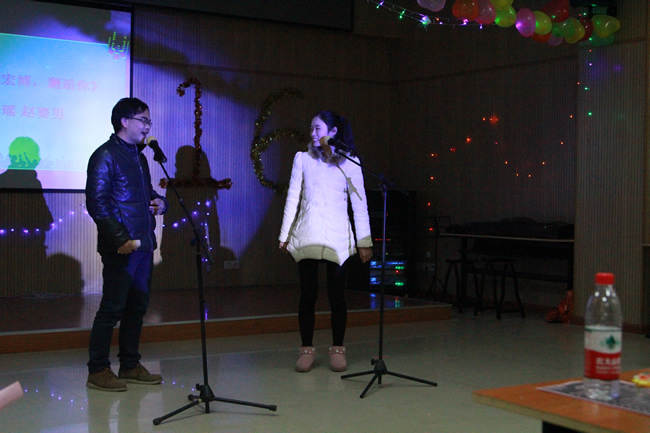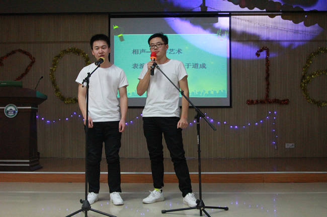 张朝龙致词,为师生送上新年祝福。青春洋溢的开场舞后晚会拉开帷幕。徐文和金炜桐同学带来的歌曲《梨花又开放》婉转悠扬的;博士李天烁和孟丽媛表演的相声《新地理图》别有新意;本科生M.A.N舞团的劲爆《Sparks》舞蹈活力十足;褚丽丽老师和吴帮、邱国庆三人合唱的《爱》将晚会推向了高潮。李瑶、赵赛男上演了原创小品《邂逅宏博,邂逅你》 令人捧腹,高康同学的一曲《小幸运》让人思绪飞扬,随着胡新乔、于道成的相声《曲解艺术》和张依诺独舞《Old English》之后,晚会迎来了压轴节目--测绘版《南山南》和《我好想你》,由吴帮演唱、金荣河吉他伴奏。