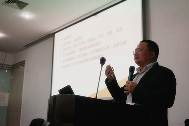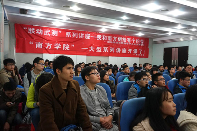 缪小林首先为同学们介绍了中国测绘行业技术装备的升级跨越历程。他以南方测绘不断发展壮大历程为例来展示我国测绘行业技术革新与科技进步历程。他强调,南方测绘从依赖价格昂贵的进口仪器,到国产仪器占领中国乃至世界的市场,是整整十年的坚持不懈与科技创新;从光学仪器到高精的电子仪器,不仅是技术的成熟,更是与国外技术的赛跑,向世界展示了中国创造的魅力。他认为,在传统测绘已经一去不复返的年代里,只有让学子们看到测绘地信行业的光明前景与远大的发展空间,才能给国家给企业培养出一批优秀的学子。