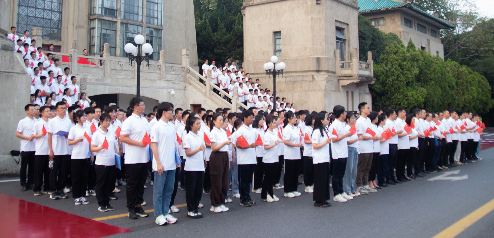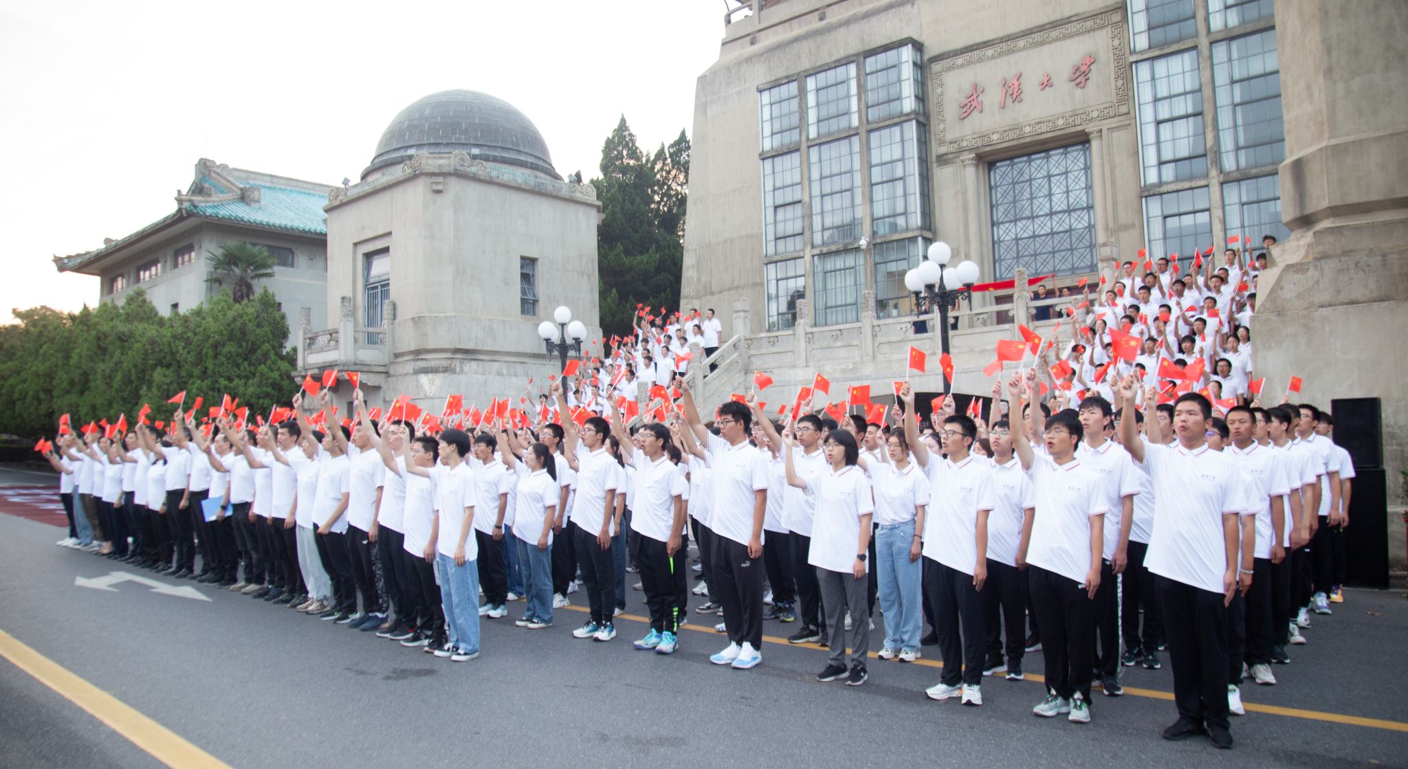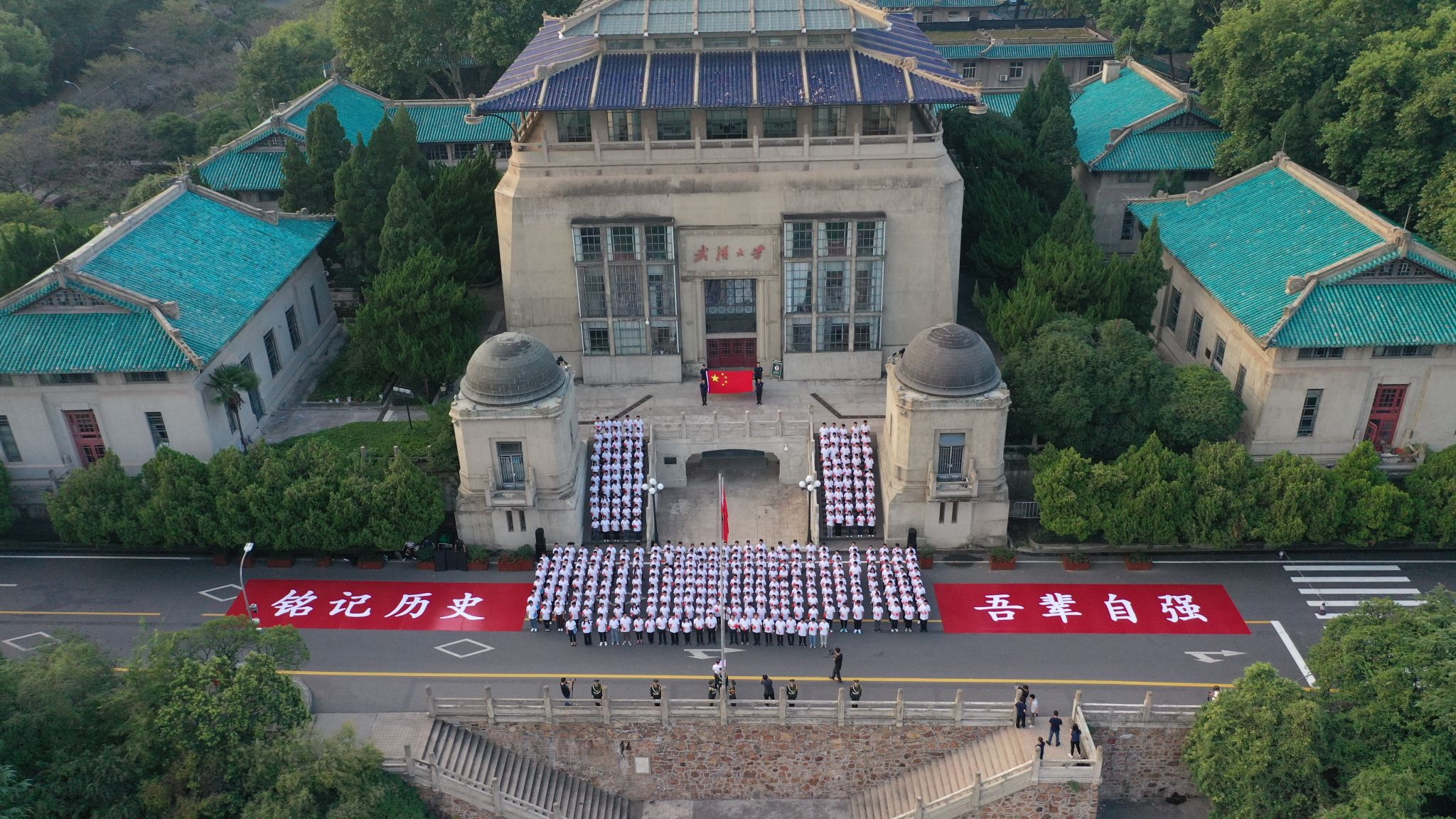 最后,全体师生面向国旗许下庄严承诺,齐喊“铭记历史,吾辈自强”。历史所启示的真理回荡在珞珈上空:正义必胜!和平必胜!人民必胜!