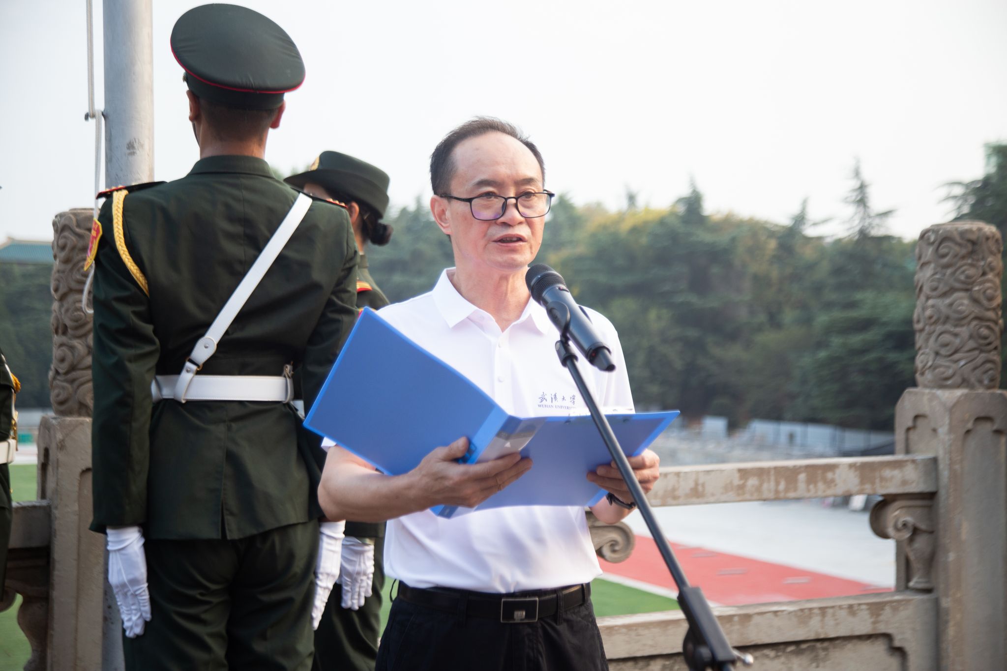 学院党委书记晏金柱为在场师生讲授微党课。九一八事变后,中国共产党提出了“坚决抗日、收复失地”的正确主张,领导中国人民开展了长达十四年的浴血奋战,成为抗日战争的中流砥柱。在战火纷飞的年代,武大师生努力用知识改变国家命运,危难之际西迁乐山,弦歌不辍,不断产出高水平科研成果。如今这种“自强弘毅”的精神依然流淌在武大人的血液之中,得以赓续百卅校史,再续华章。晏书记寄语同学们,要牢记历史,将振兴中华作为使命与担当,传承武大精神,在民族复兴的赛道上奋力奔跑。