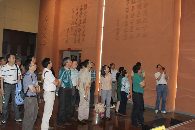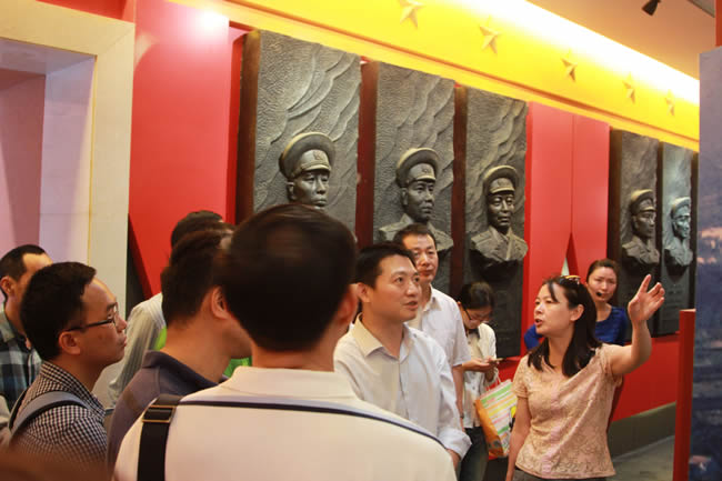 下午3点,大家来到本次参观的最后一站——徐海东大将及亲属烈士纪念馆。徐海东身经百战,英勇善战,屡建战功,被誉为“虎将军”、“徐老虎”、“中国的夏伯阳”,其一家先后有66名亲属为国捐躯,为中国人民的解放事业做出了突出贡献。纪念馆内分七个部分进行展览,陈列了其生前的一些影像资料及抗战经历,充分展示了徐海东从窑工到共和国开国大将的传奇一生。在徐向前亲手题写的“光荣流血”烈士纪念碑前,大家鞠躬默哀,共同缅怀为中国革命做出巨大牺牲与贡献的徐海东大将及其为国捐躯的亲属。