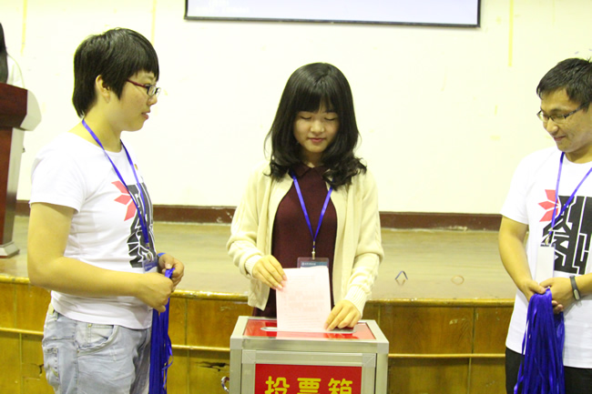 在竞选环节,10位候选人依次进行竞选演讲,并完成了抽题答辩。根据代表们投票结果,高语墨,兰可,刘洪良,吴然,校亚哲,蒲琳等6位同学成功当选新一届分团委副书记、学生会主席团成员。