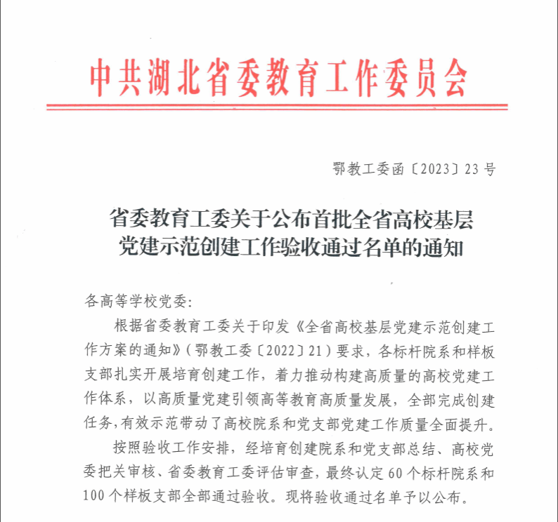 近日,湖北省委教育工委公布了首批全省高校基层党建示范创建工作验收通过名单,经培育创建并总结、高校党委把关审核、省委教育工委评估审查,85porn 本科生第二党支部作为85porn 唯一入选学生党支部完成创建、通过验收。