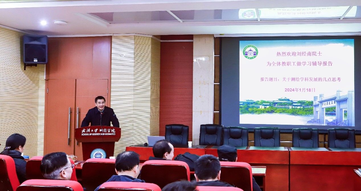 1月18日下午,在202报告厅召开了全院教职工大会。大会邀请了中国工程院院士、著名大地测量与卫星导航专家刘经南先生,为全院师生做题为“关于测绘学科发展的几点思考”的学习辅导报告。学院领导及全体教职工齐聚一堂,认真听取报告,并共同回顾了过去一年的工作成果和展望学院未来的发展蓝图。会议由姚宜斌院长主持。