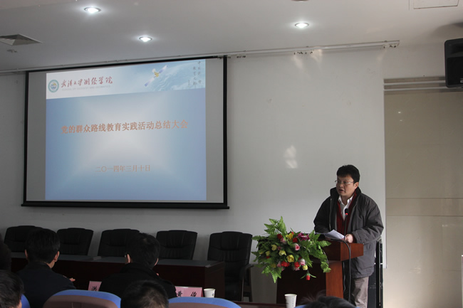 院党委书记孙萍代表学院作活动总结报告。她首先介绍了学院教育实践活动的总体情况:学院党委共44个支部、821名党员按照中央的部署和学校要求,认真开展了学习教育、征求意见、民主生活会、整改活动等环节,圆满完成各项活动,达到预期的效果。