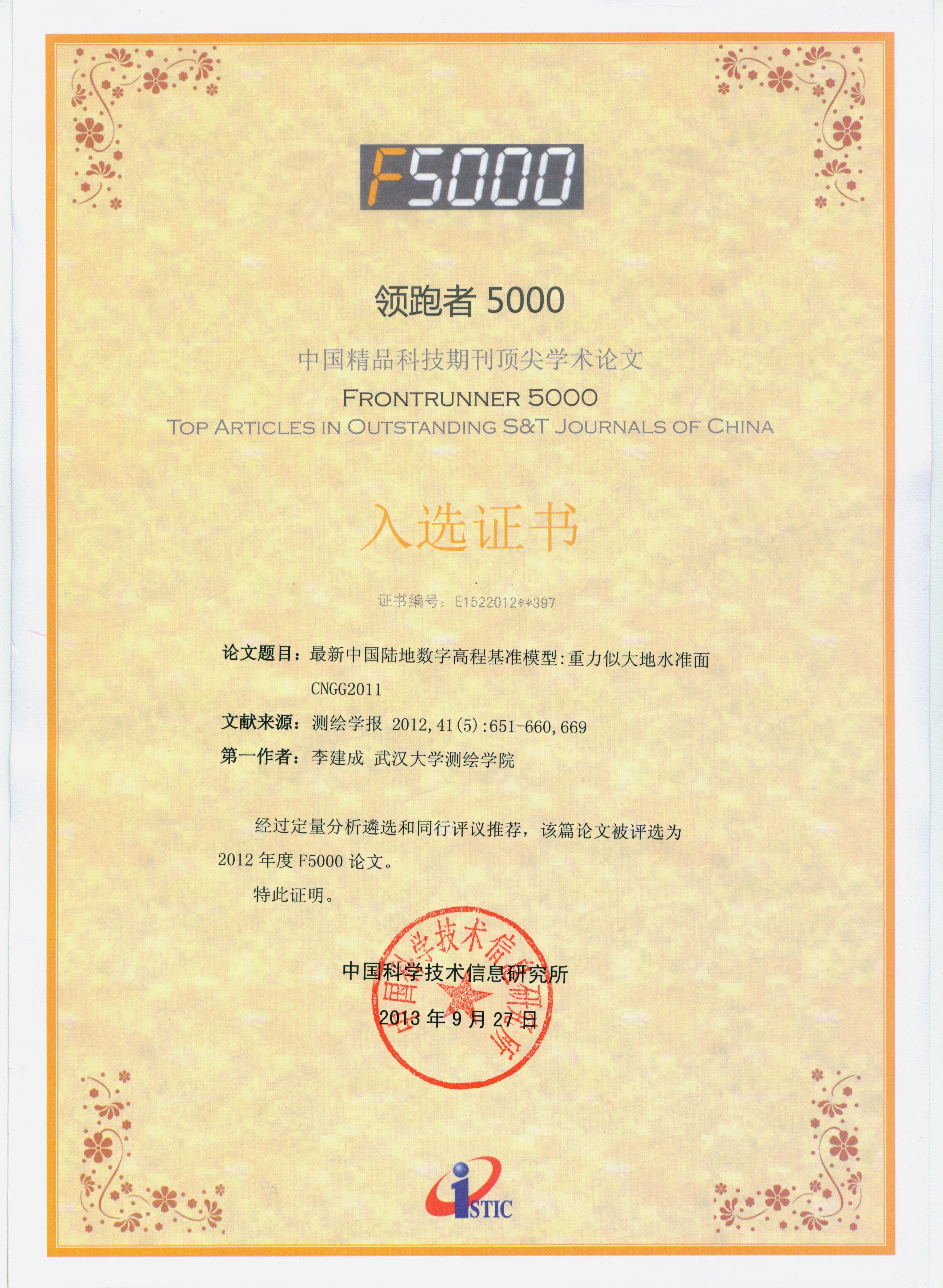 近日,85porn 李建成院士的一篇题为“最新中国陆地数字高程基准模型:重力似大地水准面CNGG2011”的论文入选中国精品科技期刊顶尖学术论文平台,即F5000(领跑者5000)。