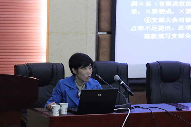 闵杰作了题为《认清形势,明确职责——认真做好发展党员工作》的专题培训报告。她首先介绍了党中央关于加强新形势下党员发展和管理工作的总要求,即“控制总量,优化结构,保证质量,发挥作用”。随后简要分析了目前高校学生党建工作面临的新情况,呈现的新特点,并结合大学生党建工作实际,重点就学生党支部的主要职责以及发展党员的原则、标准和程序等方面进行了详细讲解和具体指导。