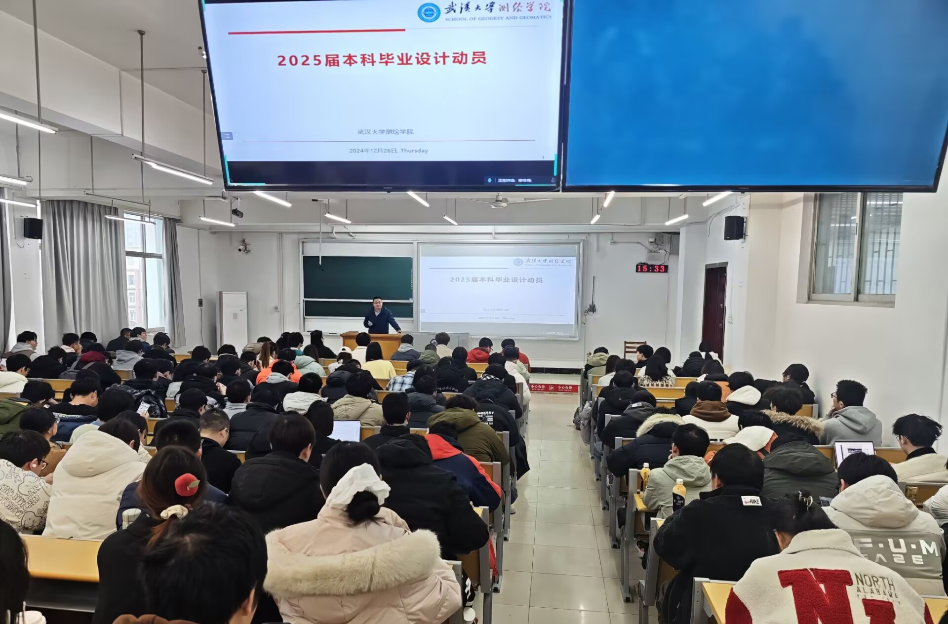 12月26日下午,测绘学院2025届本科毕业设计动员会在信息学部1-401教室召开。学院副院长郭斐、教学管理办公室和学生工作办公室负责老师、2024届优秀毕业生代表及2025届本科生近300人参加了动员会,会议由教学管理办公室主任褚丽丽主持。