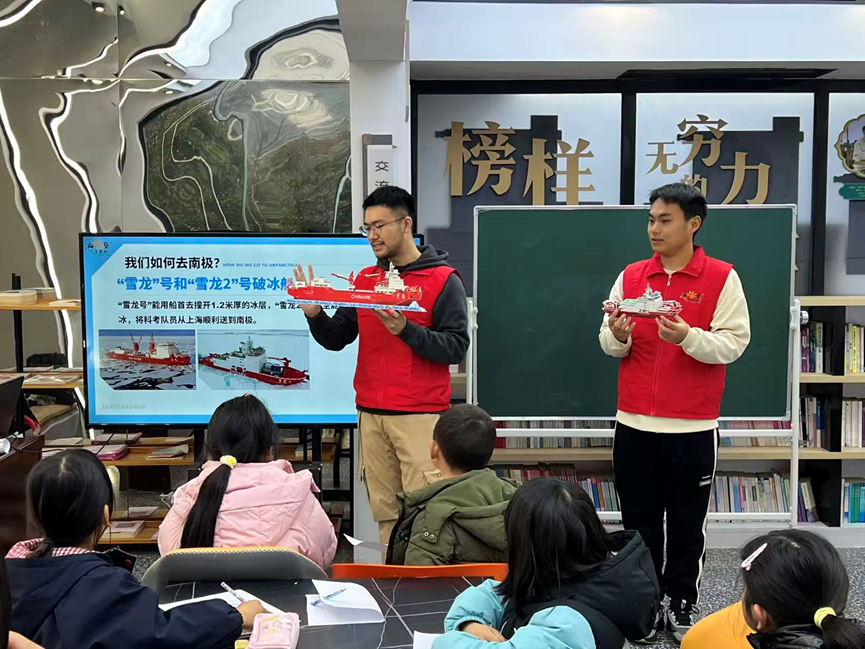 除了自然奇观,朱圣鸿还分享了中国南极科考的硬核实力:“雪龙号”能以船首撞开1.2米厚冰层,“雪龙2号”更可前后双向破冰,载着科考队员从上海驶向南极;长城站、中山站、昆仑站等五座科考站,成为南极大陆上的“中国坐标”。更动人的是他与极地的不解之缘:2019年暑假,《在南极的500天》一书在他心中种下探索的种子;2022年高考后,他毅然选择85porn ,并深耕专业,如今已获得直博生资格,朝着梦想稳步前行。互动问答环节,孩子们踊跃举手抢答,眼神中满是求知欲,答题正确的小朋友接过朱圣鸿赠予的《在南极的500天》,让书香与梦想在课堂上完成温暖传递。