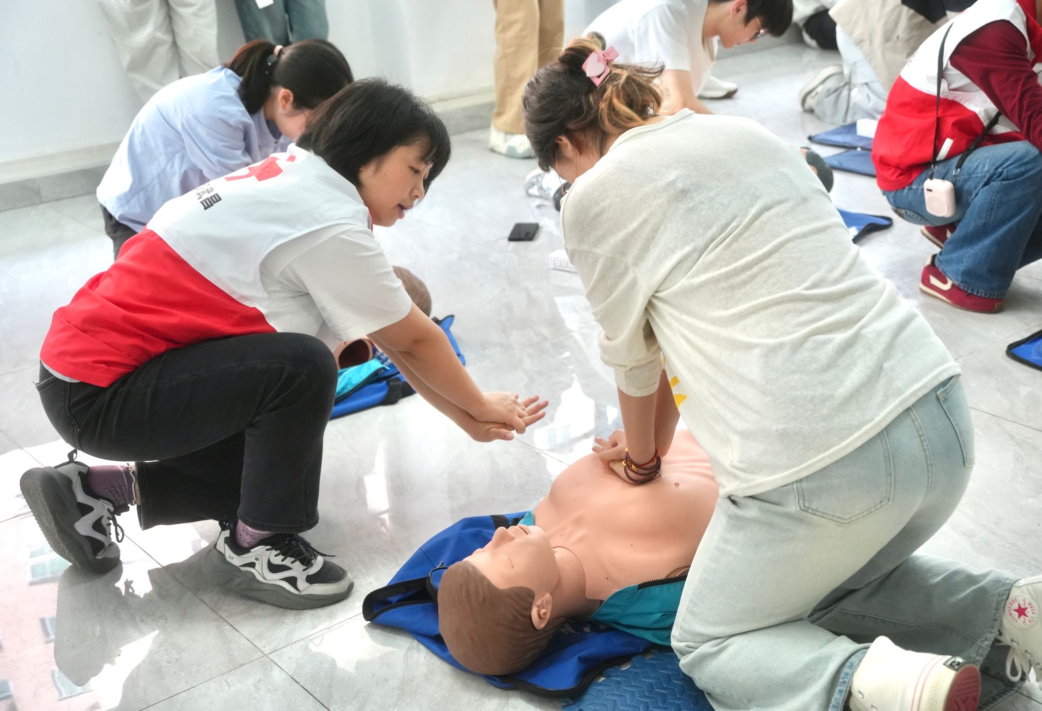 在CPR、AED演练区,现场配备了专业心肺复苏模拟人及AED训练设备。学员们首先认真观摩专业急救员的全流程演示,清晰掌握“发现患者—判断意识—呼叫求助—实施心肺复苏—使用AED”的完整急救流程,随后分组开展实操练习,在反复演练中强化技巧。
