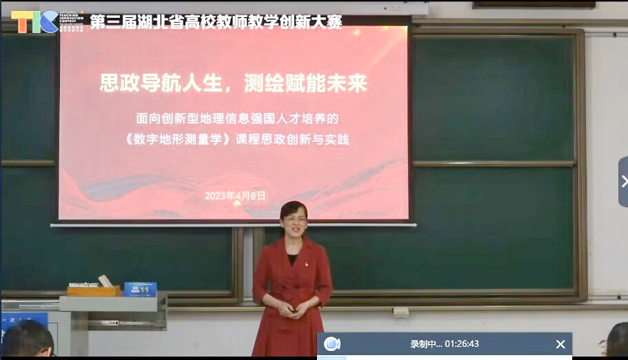 大赛中,思政组选手黄海兰老师聚焦测绘类专业特点,提出深挖专业知识中蕴含的家国情怀、工程伦理等思政元素,通过“线上线下、靶向思政”、“真实虚拟、体验思政”、“创新创业、感悟思政”和“院校企业、践行思政”的“四维协同”混合教学模式,将思政内容有机融入专业教学,进而达成“立德树人”的课程思政目标。
