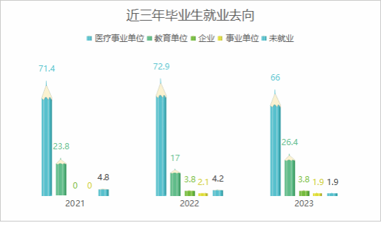 我院研究生毕业就业情况良好,近三年来,我院毕业生平均就业率达95%以上,涵盖各大医疗卫生单位、教育单位(包括高等教育和中等教育)及企、事业单位,读博率达14%。